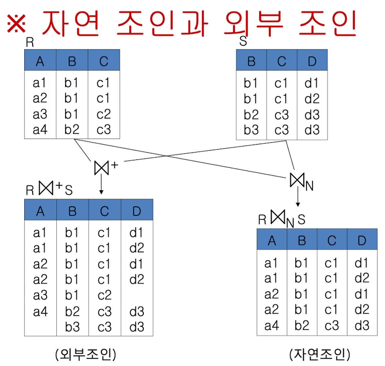 외부 합집합은 그냥 두 릴레이션을 합쳐서 전부 다 쓴다는 차이점을 가진다.