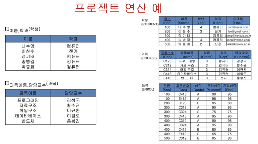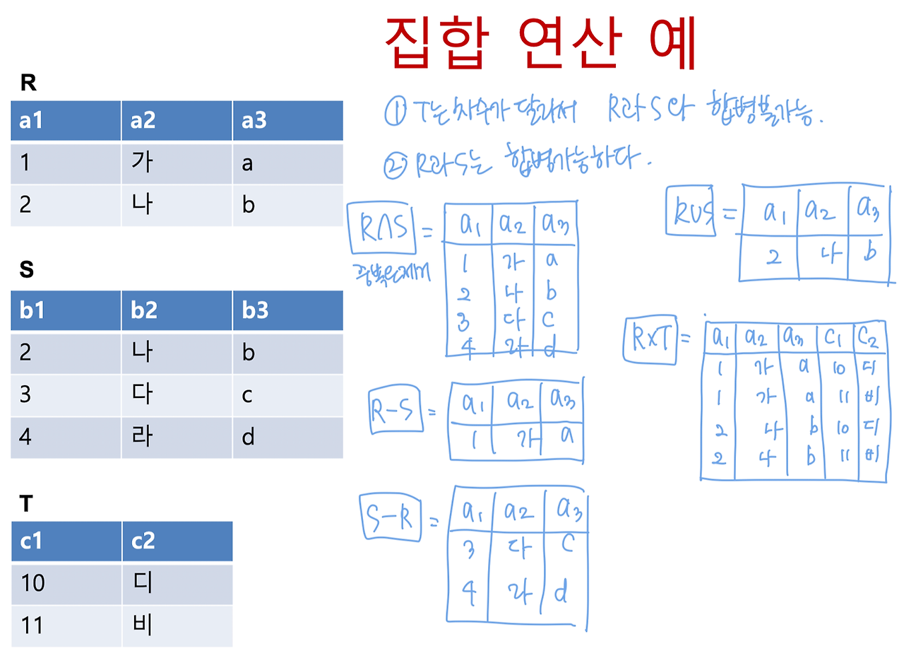 예를 들면, 합집합, 차집합, 곱집합, 프로젝트, 실렉트 를 말할 수 있다.