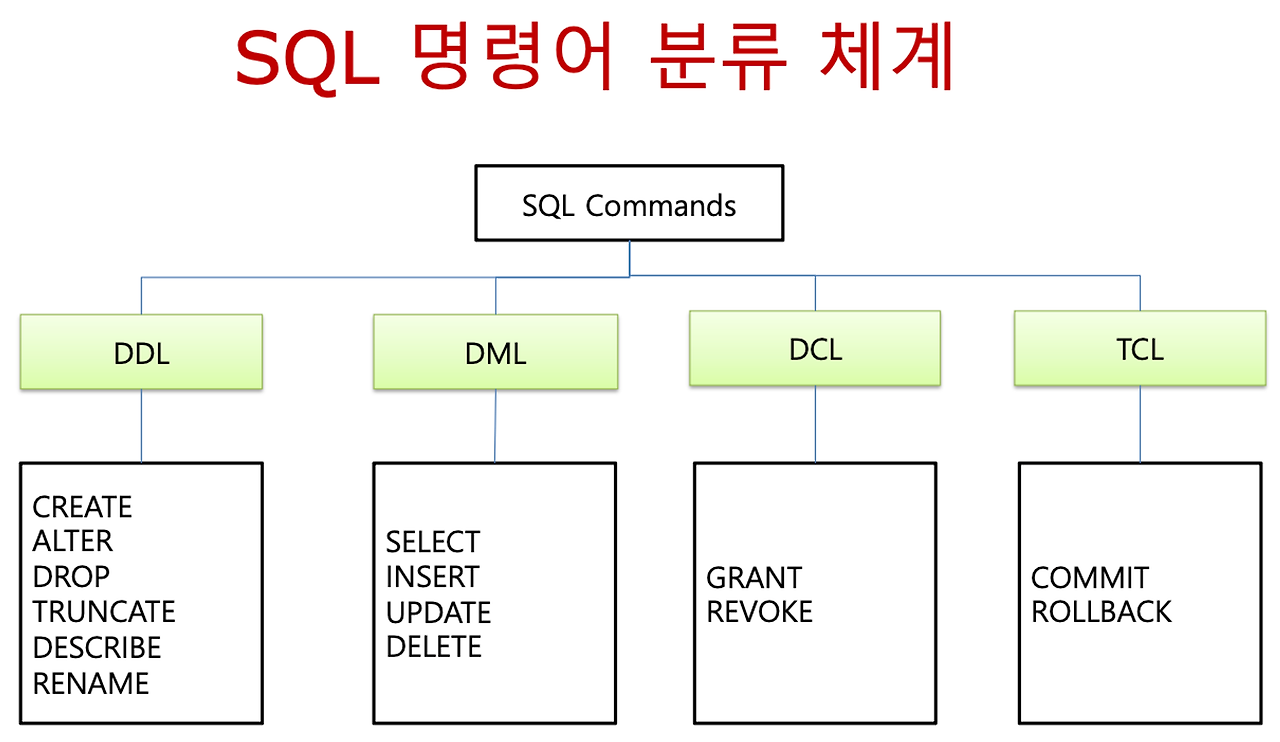 테이블을 생성할 때에는 CREATE, 테이블을 변경하고 싶을 때에는 ALTER, 삭제하고 싶을 때에는 DROP, 테이블의 구조만 남기고 투플을 다 삭제하고 싶을 때에는 TRUNCATE, 테이블의 구조를 보고 싶을 때 DESCRIBE, 테이블의 이름을 변경하고 싶을 때 RENAME 을 사용한다. 사용자의 권한을 부여하는 GRANT, 권한을 다시 뺏어오는 REVOKE 연산도 있다.