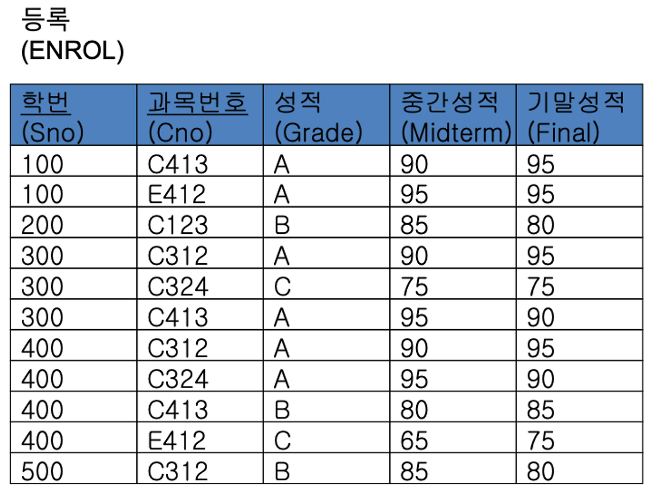 등록 테이블은 위의 두 테이블과 조금은 다른 것이 학생과 과목을 이어주는 테이블이라는 점!