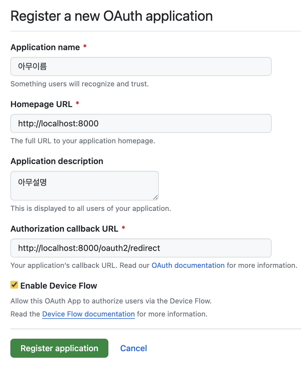 프론트와 아직 연동전이고, 벡엔드 상에서만 테스트 진행할 예정이어서 일단은 홈페이지와 콜벡 url 모두 벡엔드상 주소로 입력해줍니다!