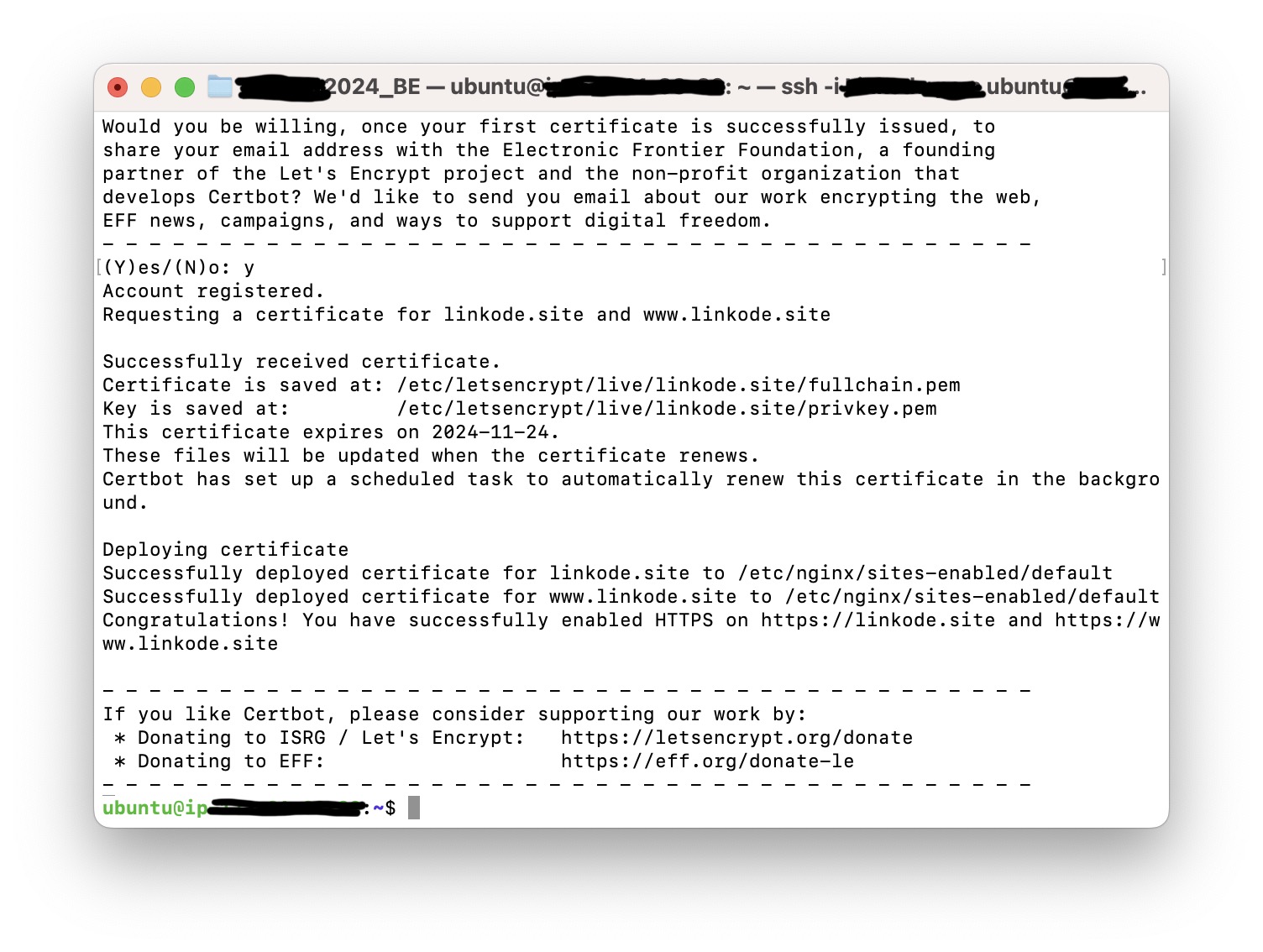 저는 도메인 두개를 전부 입력할건데, sudo certbot --nginx -d [도메인] -d [도메인] 으로 나열해서 사용할 수 있습니다.