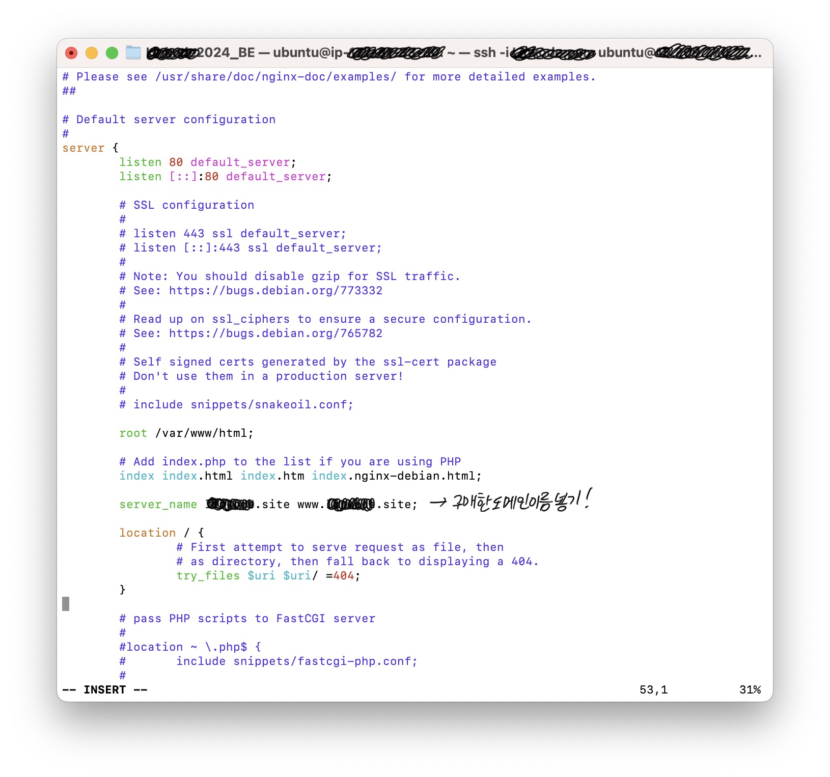 server_name 에 아까 가비아에서 입력했던 두가지 도메인을 모두 입력해줍니다. 입력을 완료하면 `esc` -> `:wq` 를 누르고 나와줍니다.