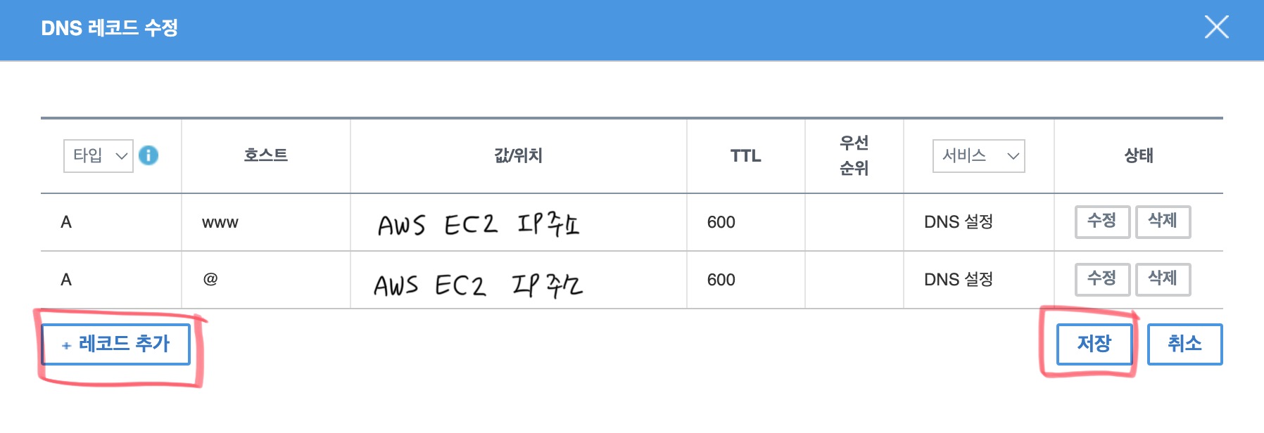 오른쪽에 있는 `설정`을 누르고, `레코드 수정` 을 눌러줍니다.